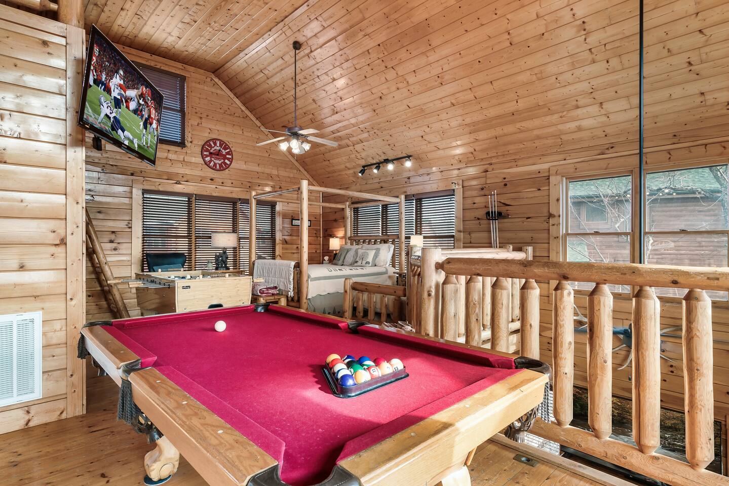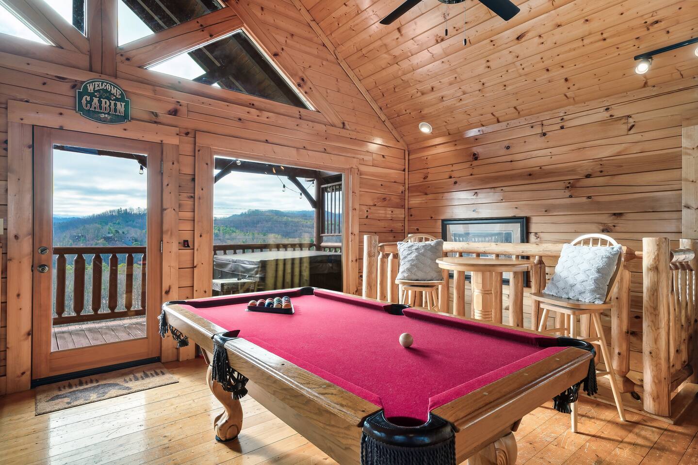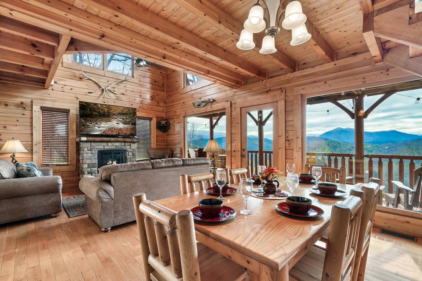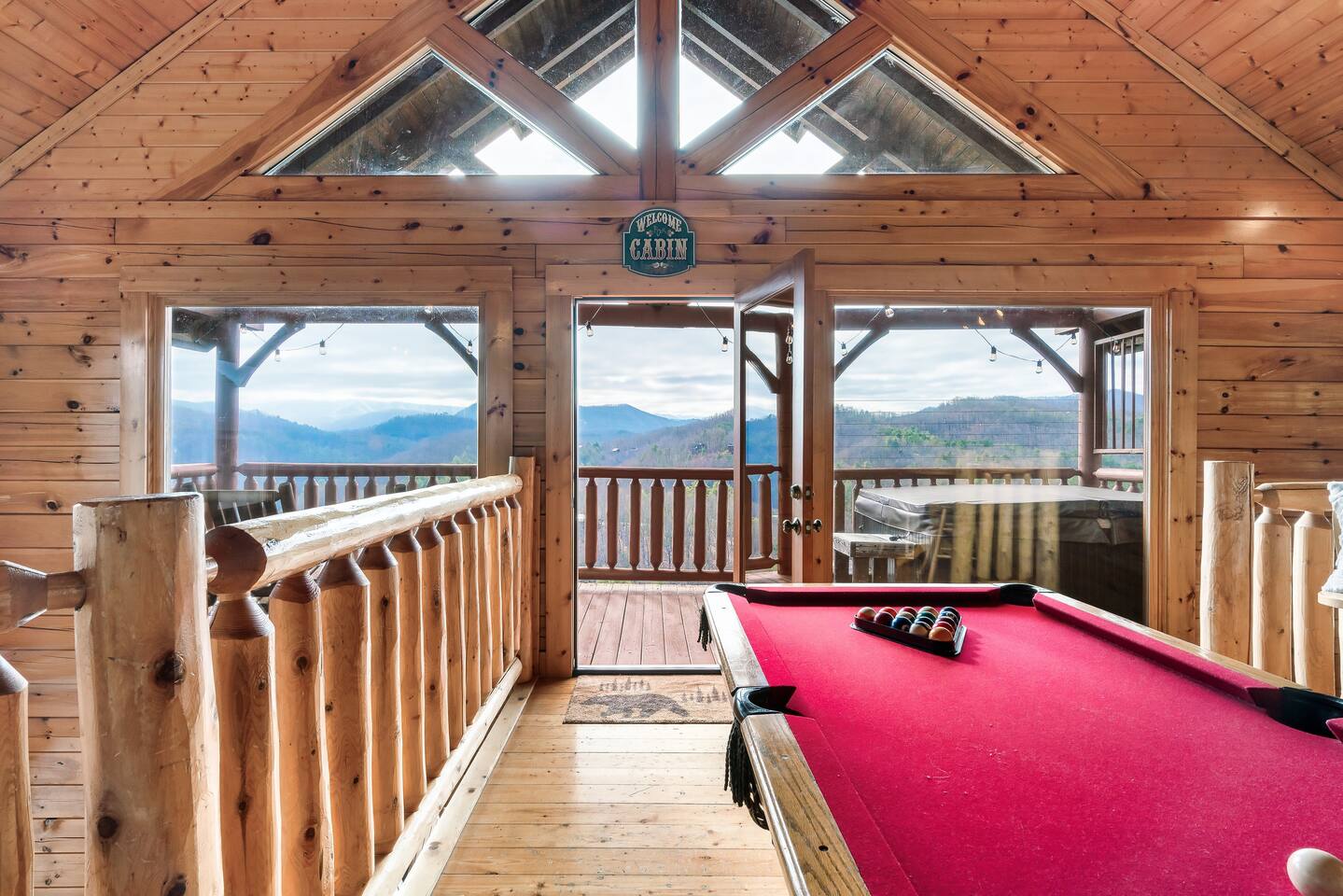-open floor plan -2 porches overlooking mountains and wildlife -hot tub -jacuzzi - fully stocked kitchen -fireplace (electric, turn on easily with the flip of a switch, blows heat into room) -interior dining table area for 6 -exterior dining area for 4 -King suite on main level -2nd level queen bed with jacuzzi bath with separate walk-in shower -2nd level daybed with trundle (2 twin mattresses) - 2nd level pool and foosball tables -3rd floor sleeping loft (2 full size floor beds)
