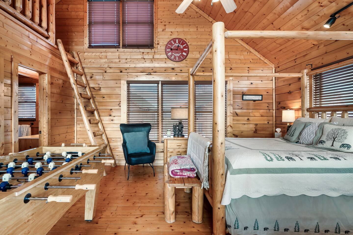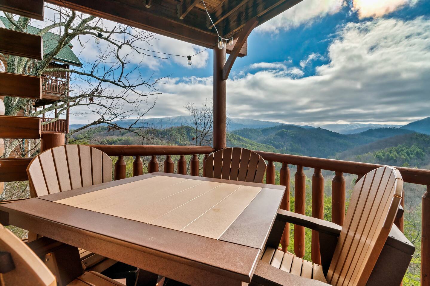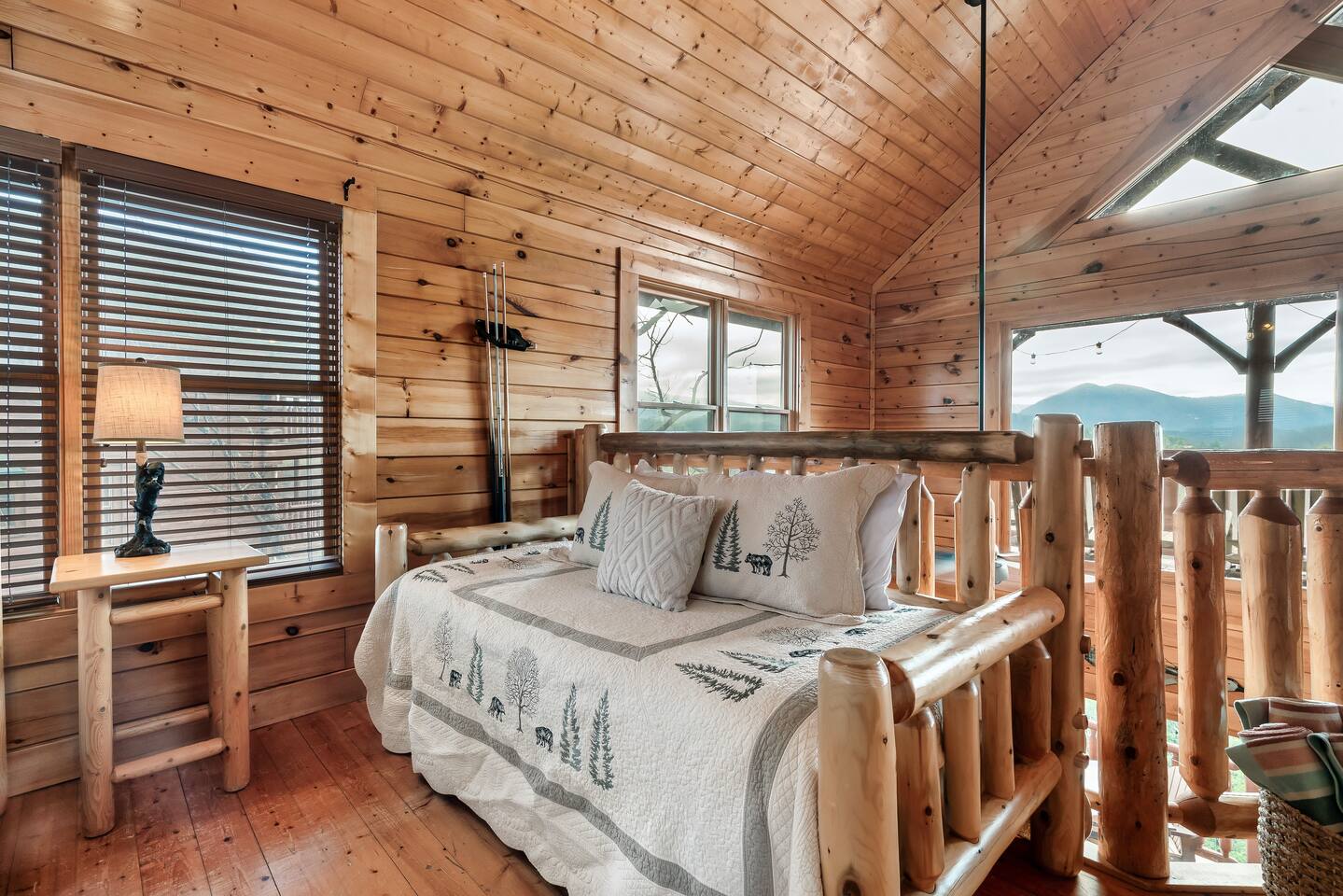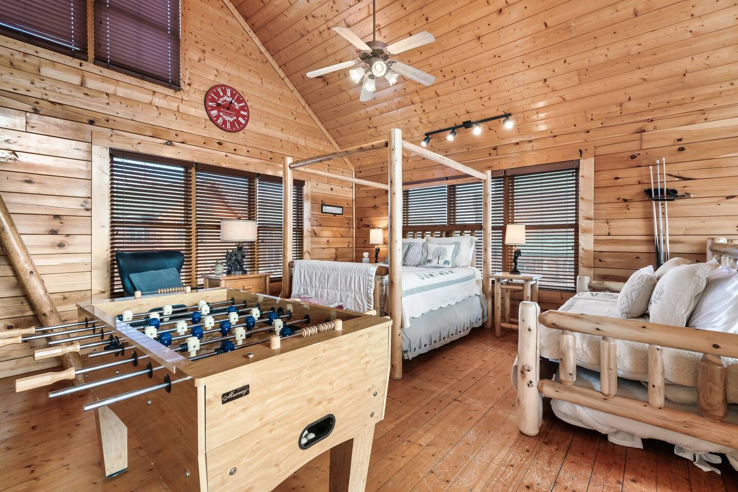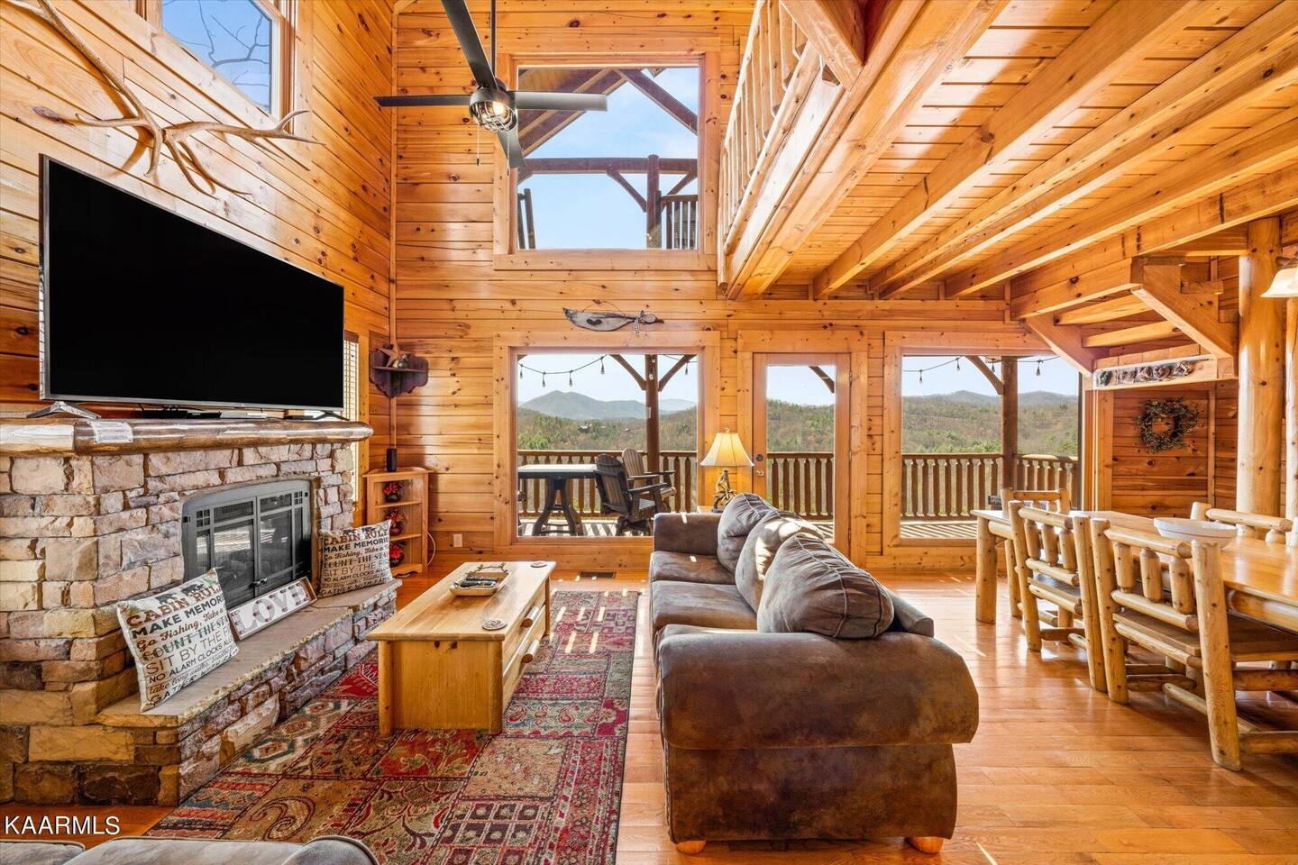 -open floor plan -2 porches overlooking mountains and wildlife -hot tub -jacuzzi - fully stocked kitchen -fireplace (electric, turn on easily with the flip of a switch, blows heat into room) -interior dining table area for 6 -exterior dining area for 4 -King suite on main level -2nd level queen bed with jacuzzi bath with separate walk-in shower -2nd level daybed with trundle (2 twin mattresses) - 2nd level pool and foosball tables -3rd floor sleeping loft (2 full size floor beds)